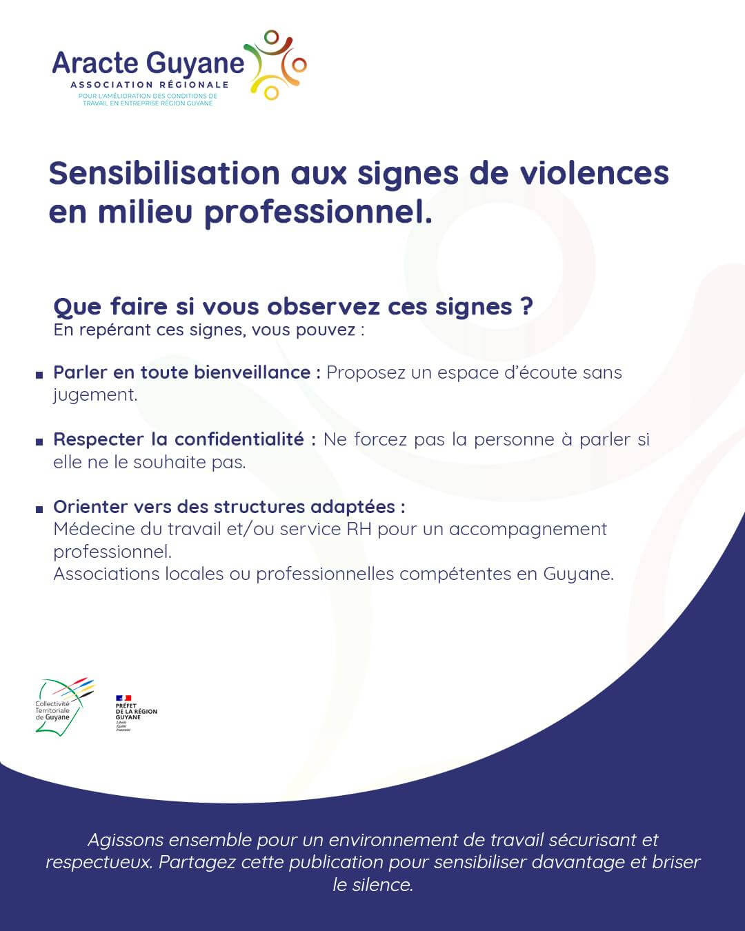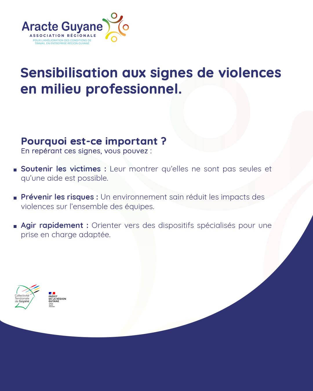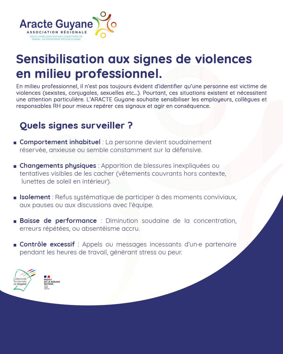 En milieu professionnel, il n’est pas toujours évident d’identifier qu’une personne est victime de violences. Pourtant, ces situations existent et nécessitent une attention particulière. L’ARACTE Guyane souhaite sensibiliser les employeurs, collègues et responsables RH pour mieux repérer ces signaux et agir en conséquence.